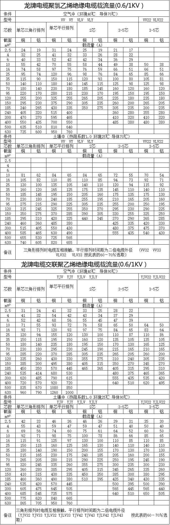 低壓電纜載流量表